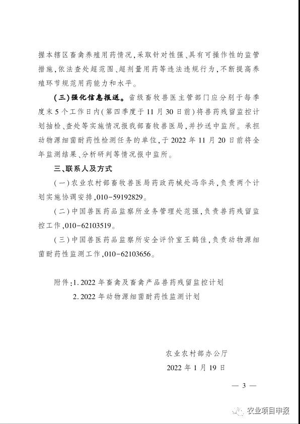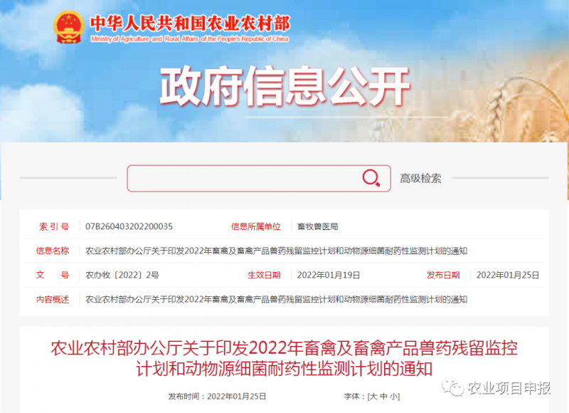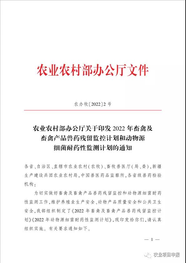 为切实做好畜禽及畜禽产品兽药残留监控和动物源细菌耐药性监测工作,维护养殖业生产安全、动物产品质量安全和公共卫生安全,我部组织制定了《2022年畜禽及畜禽产品兽药残留监控计划》《2022年动物源细菌耐药性监测计划》,现印发给你们,请认真组织实施。有关要求通知如下。