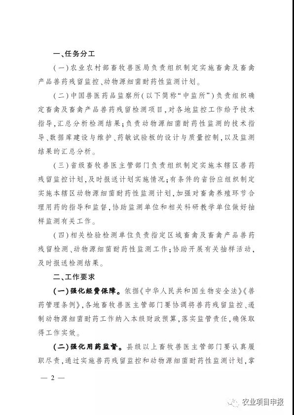 (一)强化经费保障。依据《中华人民共和国生物安全法》《兽药管理条例》,各地畜牧兽医主管部门要协调将兽药残留监控、遏制动物源细菌耐药工作纳入本级财政预算,落实监管责任,确保取得工作实效。