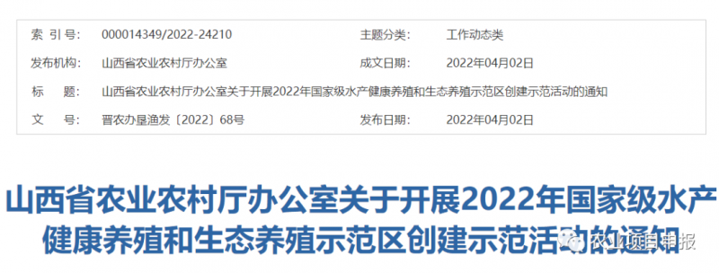 山西省农业农村厅办公室关于开展2022年国家级水产健康养殖和生态养殖示范区创建示范活动的通知