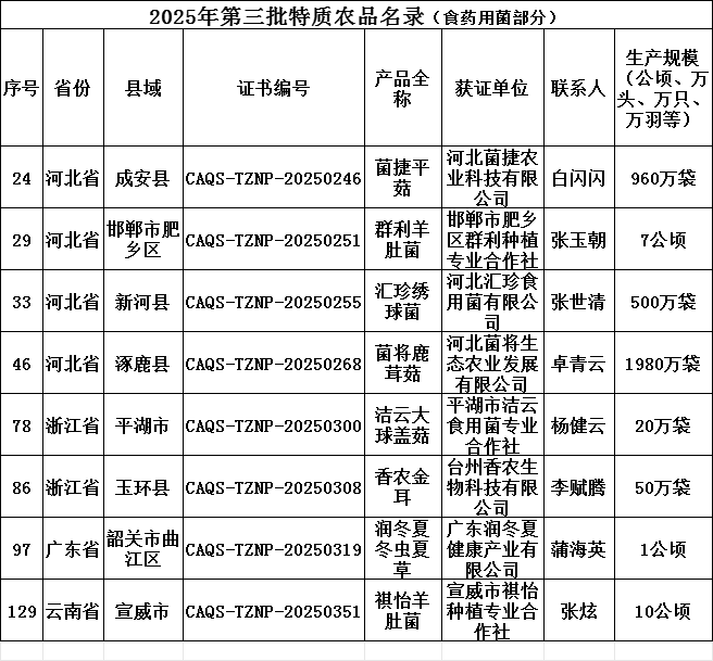 此外,农业农村部农产品质量安全中心还公布了2025年第三批特质农品名录,全国共152个产品被纳入名录,其中8个食药用菌产品入选。